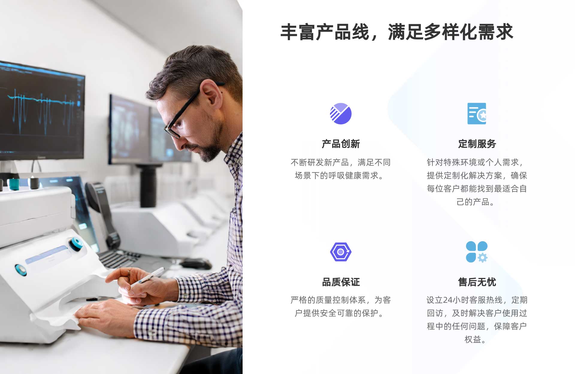 我們的產(chǎn)品線豐富多樣,從呼吸產(chǎn)品到呼吸耗材,從專業(yè)的技術服務到穩(wěn)定的售后保障,從專用設備到普通耗材。都凝聚了我們對醫(yī)療健康的深刻理解。我們不僅滿足客戶的需求,更致力于超越客戶的期待。公司與多家知名醫(yī)療機構(gòu)和渠道商建立了長期穩(wěn)定的合作關系,在行業(yè)內(nèi)享有良好的聲譽。我們提供的不僅是產(chǎn)品,更是一站式的解決方案和全方位的技術服務支持。從售前的專業(yè)咨詢到售后的細致服務,我們始終與客戶并肩同行,確保每一位合作伙伴都能獲得成功。