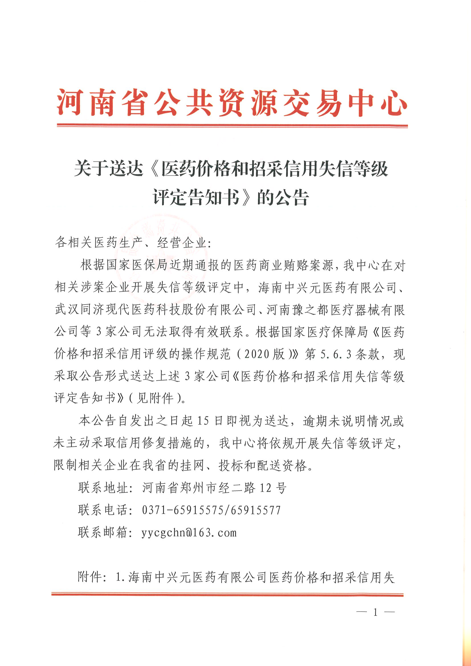 各相關(guān)醫(yī)藥生產(chǎn)、經(jīng)營企業(yè):根據(jù)國家醫(yī)保局近期通報的醫(yī)藥商業(yè)賄賂案源,我中心在對相關(guān)涉案企業(yè)開展失信等級評定中,海南中興元醫(yī)藥有限公司、武漢同濟(jì)現(xiàn)代醫(yī)藥科技股份有限公司、河南豫之都醫(yī)療器械有限公司等3家公司無法取得有效聯(lián)系。根據(jù)國家醫(yī)療保障局《醫(yī)藥價格和招采信用評級的操作規(guī)范(2020版)》第5.6.3條款,現(xiàn)采取公告形式送達(dá)上述3家公司《醫(yī)藥價格和招采信用失信等級評定告知書》(見附件)。本公告自發(fā)出之日起15日即視為送達(dá),逾期未說明情況或未主動采取信用修復(fù)措施的,我中心將依規(guī)開展失信等級評定,限制相關(guān)企業(yè)在我省的掛網(wǎng)、投標(biāo)和配送資格。聯(lián)系地址:河南省鄭州市經(jīng)二路12號聯(lián)系電話:0371-65915575/65915577聯(lián)系郵箱:yycgchn@163.com
