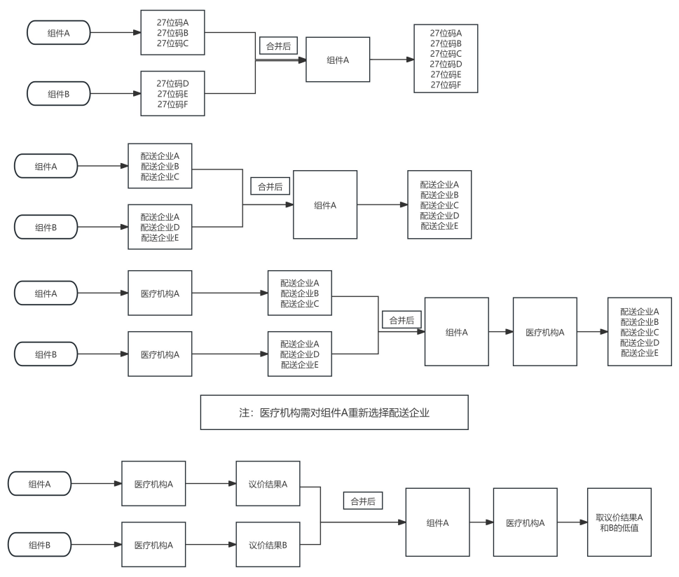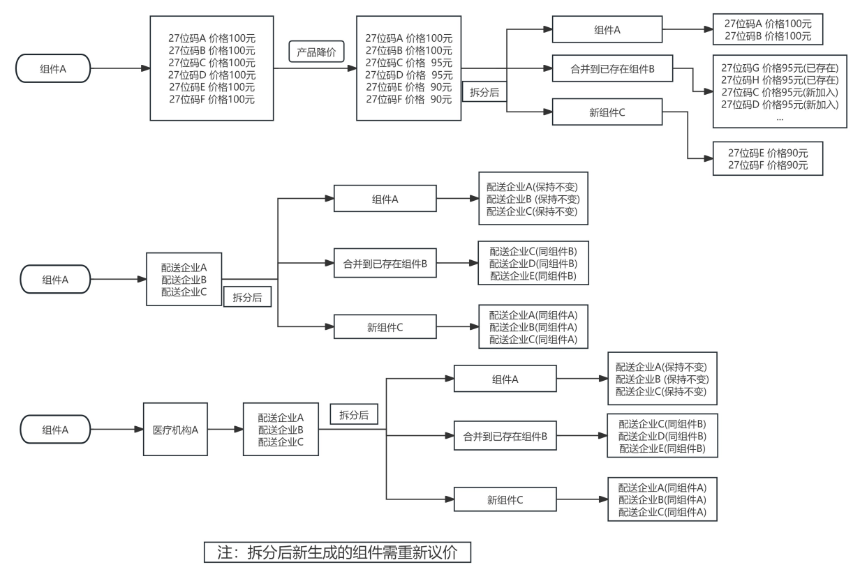組件拆分僅針對(duì)同一組件下部分產(chǎn)品降價(jià),經(jīng)審核無(wú)誤后,平臺(tái)將按照20位全國(guó)統(tǒng)一醫(yī)保信息業(yè)務(wù)編碼相同、掛網(wǎng)價(jià)格一致的組件管理規(guī)則,對(duì)掛網(wǎng)價(jià)格發(fā)生變化的產(chǎn)品自動(dòng)生成新的組件或合并到已有組件中,新生成的組件保留該產(chǎn)品原有組件的配送關(guān)系,但需重新議價(jià);產(chǎn)品合并到已有組件的,不再保留該產(chǎn)品原有組件的配送關(guān)系和議價(jià)結(jié)果。