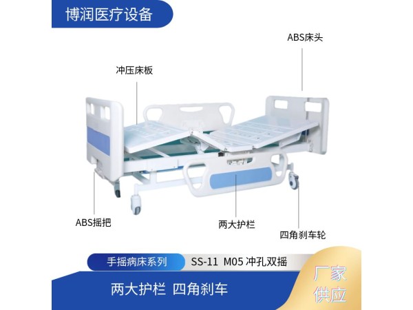 產(chǎn)品說明:雙搖手動病床配備:輸液架六檔鋁合金護欄引流掛鉤雜物架直徑125mm全包式帶剎腳輪