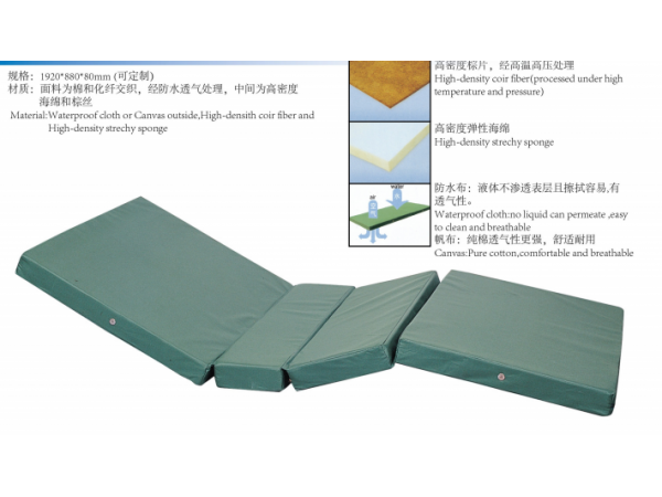 產(chǎn)品說明:38D密度海綿4CM+椰棕4CM防水牛津布 PU布料防水防漬防污,四折,二折尺寸大小可以定制。醫(yī)用床墊,單搖雙搖病床床墊