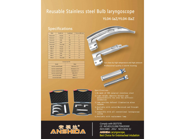 產(chǎn)品說明:麻醉咽喉鏡YL04-IaZ(全鋼燈泡喉鏡)產(chǎn)品適用范圍:該產(chǎn)品用于手術開始前的麻醉、插管和復蘇,在插管過程中用喉鏡,可清楚觀察呼