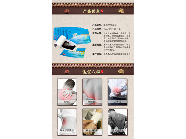 產(chǎn)品說明:成分:該產(chǎn)品由含有遠(yuǎn)紅外陶瓷粉的無紡布,永磁片,發(fā)熱袋,壓敏膠及硅油紙組成,磁熱療溫度范圍在40-60℃,磁感應(yīng)強(qiáng)度范圍80-12