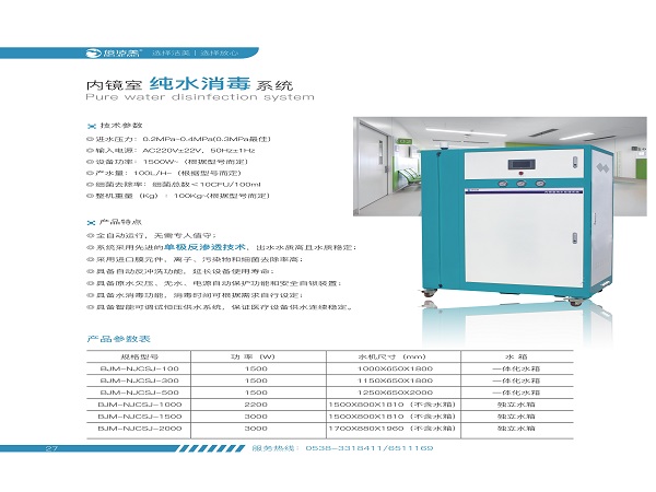 產(chǎn)品說明:內(nèi)鏡室純水系統(tǒng)型號:BJM-NJCSJ-2000整體尺寸:1700mm×880mm×1960mm技術參數(shù):1.產(chǎn)水量:≥2000L/h2.純水水質(zhì):符合WS507-2016