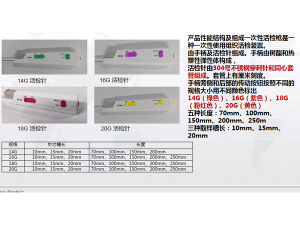產(chǎn)品說明:用于在B超或X-線監(jiān)視下,經(jīng)皮穿刺進(jìn)行實(shí)質(zhì)性臟器或腫瘤的細(xì)胞學(xué)活檢或其他軟組織活檢。如肝臟、腎臟、甲狀腺、前列腺、乳腺、胰
