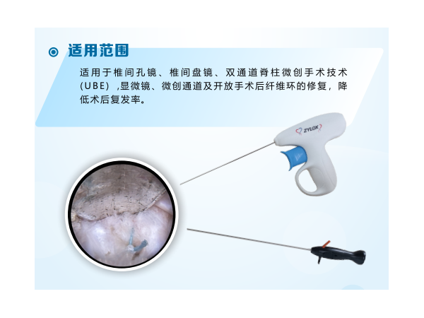 產(chǎn)品說明:一次性纖維環(huán)縫合吻合器適用范圍:適用于椎間孔鏡、椎間盤鏡、雙通道脊柱微創(chuàng)手術(shù)技術(shù)(UBE),顯微鏡、通道管等微創(chuàng)手術(shù)髓核摘除