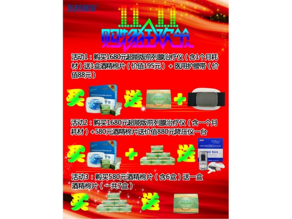 產(chǎn)品說明:東科瑞寶2017年雙11活動1:買1280元超值版前列腺治療儀(含1個月耗材)送1瓶導(dǎo)電液(單價60元)2:買1680元超能版前列腺治療儀(