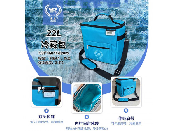 產(chǎn)品說明:容積:22L 顏色:黑色、藍色材料:面料:耐磨防水布保溫層:保溫泡沫棉里料:鋁箔外尺寸:330*260*320mm標(biāo)配:冰袋4個,外顯保冷