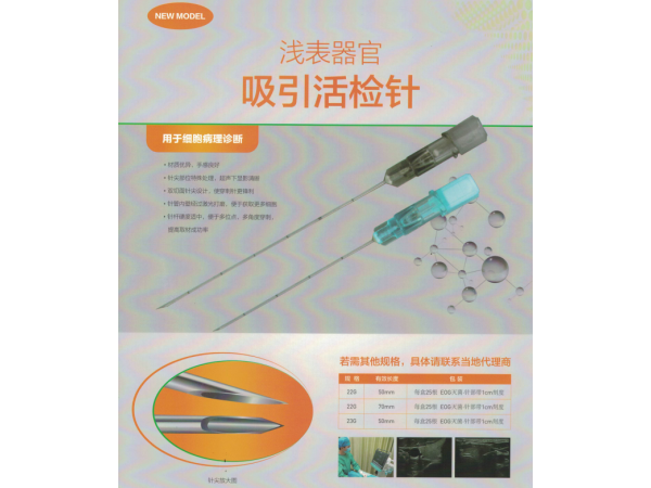 產(chǎn)品說明:產(chǎn)品簡(jiǎn)介:【適用】乳房、甲狀腺、淋巴結(jié)等體表腫塊的細(xì)胞活檢?!咎攸c(diǎn)】針管附有受柄,操作簡(jiǎn)便。針尖背面有側(cè)孔,能更多有效的
