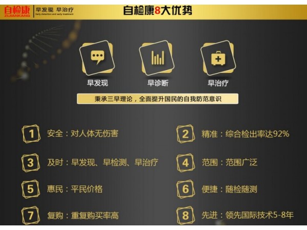產(chǎn)品說明:健康檢測是中國億萬家庭的健康大需求,市場極其廣闊,自檢康健康檢查至關(guān)重要,早期檢測,早期發(fā)現(xiàn),早期治療,徹底根治,能夠挽