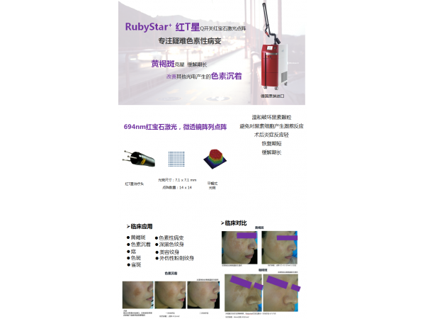 產(chǎn)品說(shuō)明:Q開(kāi)關(guān)紅寶石點(diǎn)陣激光是德國(guó)Asclepion激光公司研制的,優(yōu)勢(shì)在于其彌補(bǔ)了傳統(tǒng)紅寶石激光設(shè)備在亞洲人群應(yīng)用上的壁壘,同時(shí),突破性的