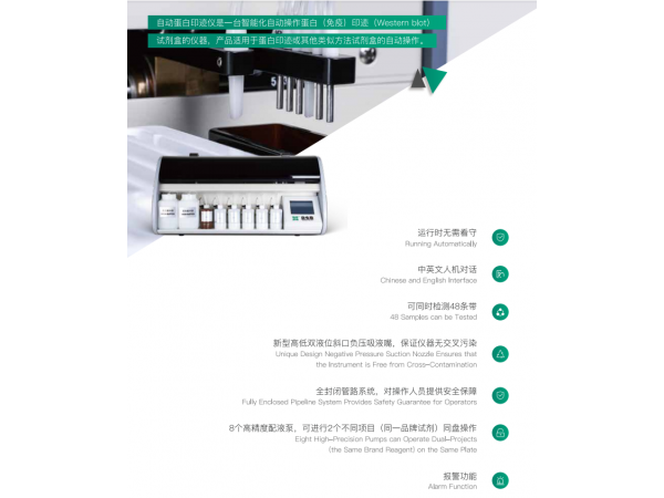 產(chǎn)品說明:附件包括溫育槽、試劑瓶、廢液瓶、溢流瓶、底物遮光罩、隨機(jī)軟件、判讀軟件、電源線和電源適配器。 實(shí)現(xiàn)免疫印跡法膜條的自動(dòng)化