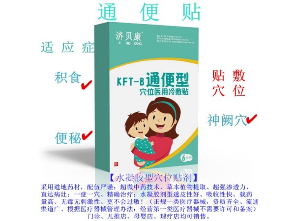 產品說明:濟貝康通便貼:積食發(fā)熱、便秘。貼敷神闕穴(肚臍),一天一次,8-12小時更換一次最佳。水凝膠穴位貼劑產品簡介:指藥材提取物、藥