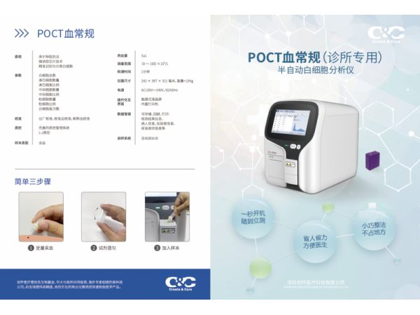 產(chǎn)品說明:創(chuàng)懷醫(yī)療微流控技術(shù),專門針對98萬家基層醫(yī)療機構(gòu)開發(fā)的POCT血常規(guī)產(chǎn)品,也是市場上僅有的一款以金標(biāo)準(zhǔn)方法學(xué)開發(fā)的POCT血常規(guī)產(chǎn)