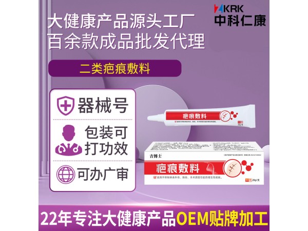 產品說明:吉博士疤痕敷料 20g/支 二類械字號 全國火爆招商中適用范圍:用于抑制體表外傷、燒傷、手術原因引起的疤痕型增生。生產廠家:中