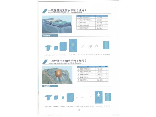 產(chǎn)品說明:本產(chǎn)品由一次性使用無菌手術(shù)膜、包布、洞巾、臺套、手術(shù)鋪巾、手術(shù)巾、醫(yī)用彈力繃帶(四肢)、儀器套、擦手紙、醫(yī)用外科敷料、夾子