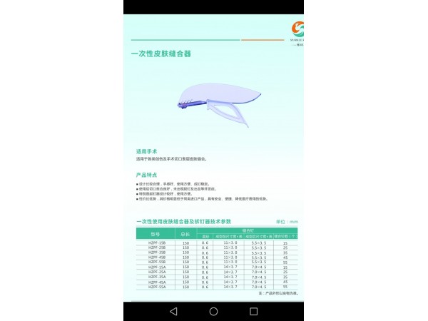 產(chǎn)品說明:一次性使用皮膚縫合器及拆釘鉗器適用于心胸外科、神經(jīng)外科、腫瘤科、骨科、急診創(chuàng)傷外科、燒傷科、整形科、乳腺外科、婦產(chǎn)科、泌