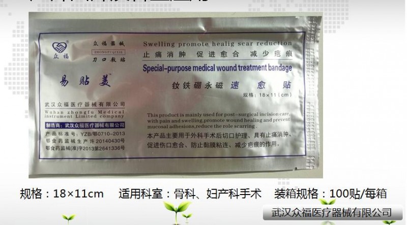 ?功能;本產(chǎn)品《釹鐵硼永磁速愈貼》主要用于外科手術(shù)切口的護(hù)理,具有止痛、消腫、促進(jìn)傷口愈合、防止粘膜粘連的作用。優(yōu)勢;替代傳統(tǒng)換藥,適用于手術(shù)室、普外科、骨科、腦外泌外科、婦產(chǎn)科等科室使用,產(chǎn)品除住院使用外醫(yī)生還可以開處方給患者帶回家自己使用,產(chǎn)品適應(yīng)科室廣泛、用量大空間大。
