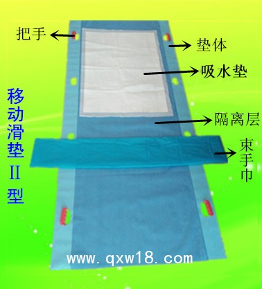 移動(dòng)滑墊由非織造布、滑膜層組成。輔件為隔離層、吸水棉,根據(jù)需要可選用。主要用于危重病人的位置移動(dòng),減少病人在轉(zhuǎn)移過程中受到的傷害。