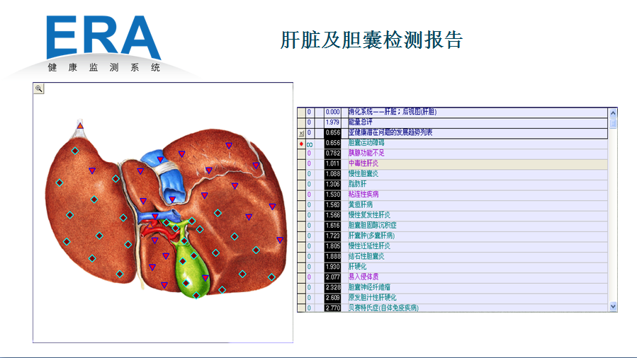 ERA健康監(jiān)測系統(tǒng)采用3D立體彩色圖像,為受檢者提供形象生動、清晰明了的健康信息,改變了以往受檢者被動、茫不可知的地位。ERA用淺顯易懂的六級符號來表達各種器官的細胞功能狀態(tài),幫助受檢者直觀了解自己身體的基本情況。綜合指標分析還能夠讓檢測醫(yī)師獲得更加精準的疾病監(jiān)測結(jié)果,為受檢者提供更具建設(shè)性,更有效的康復(fù)建議。