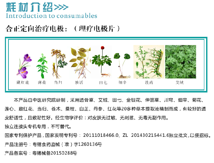 本產(chǎn)品由中醫(yī)研究院研制,采用透骨草、艾絨、田七、金銀花、伸筋草、川穹、細(xì)辛、菊花、蓮心、藏紅花、當(dāng)歸、蒼術(shù)、桑枝、白芷、丹參、紅花等20多種草本植物提取液精制而成,有較好的透皮舒適性,且敷貼性好。經(jīng)生物學(xué)評價:對皮膚無過敏、無刺激、無毒。獨(dú)立連接頭專機(jī)專用,不可替代。