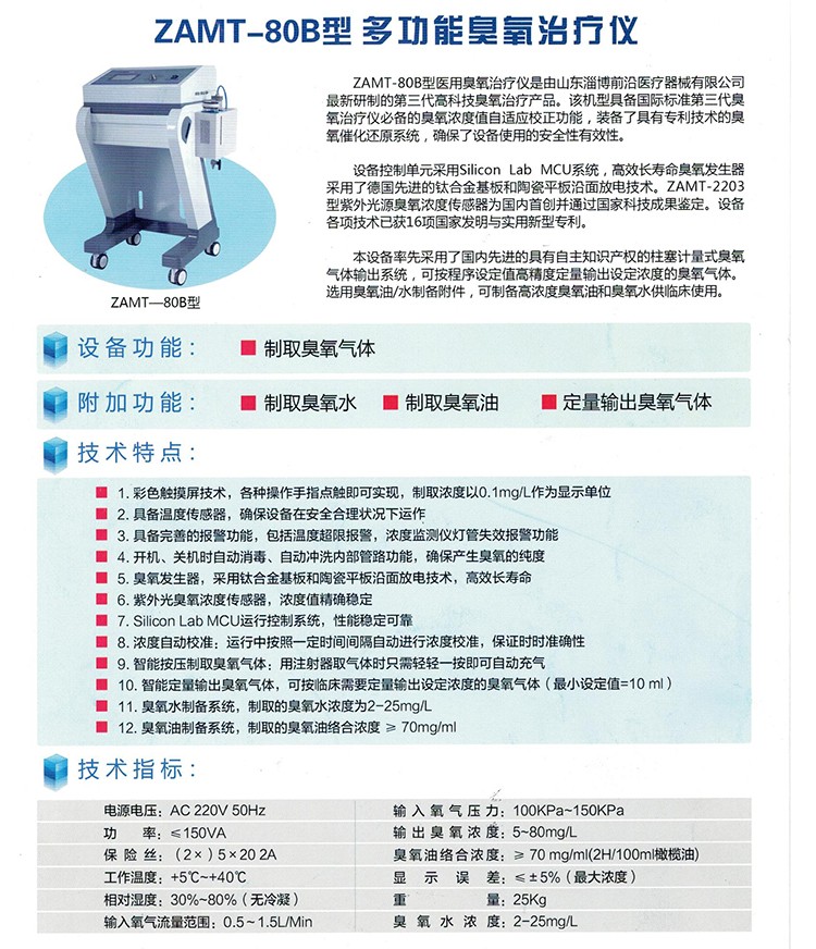 ZAMT-80B推車式臭氧治療儀除可用于三氧大自血治療之外,還可制備臭氧水。臭氧水可以直接食用,治療慢性胃炎、口腔潰瘍、傷口清洗具有很好的效果。