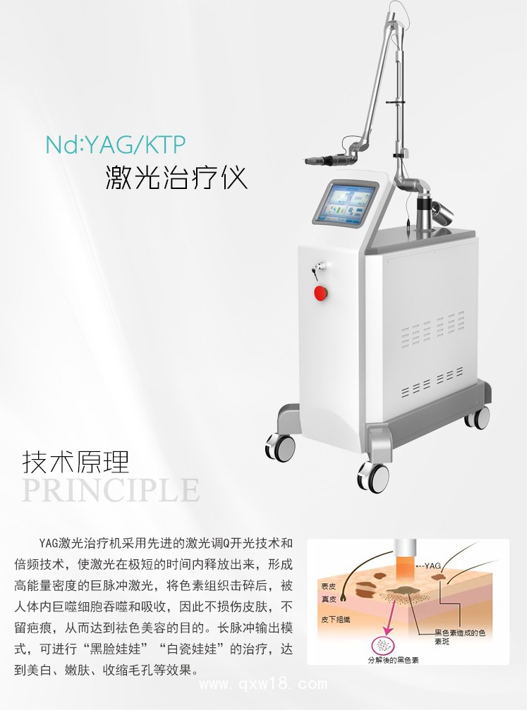 Nd:YAG/KTP激光治療機采用先進的激光調(diào)Q開光技術(shù)和倍頻技術(shù),使激光在極短的時間內(nèi)釋放出來,形成高能量密度的巨脈沖激光,將色素組織擊碎后,被人體內(nèi)巨噬細(xì)胞吞噬和吸收,因此不損傷皮膚,不留疤痕,從而達到祛色美容的目的。長脈沖輸出模式,可進行“黑臉娃娃”“白瓷娃娃”的治療,達到美白、嫩膚、收縮毛孔等效果。