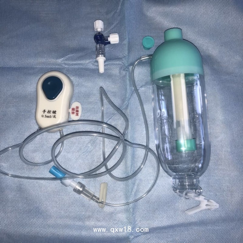 由加藥裝置(帶防回流閥)、液囊(彈力貯液裝置)、藥液過濾器、液囊保護(hù)外殼、限流裝置、自控給液裝置、開關(guān)、管路和接頭組成。產(chǎn)品經(jīng)環(huán)氧乙烷滅菌后無菌,為一次性使用,本產(chǎn)品不含藥。