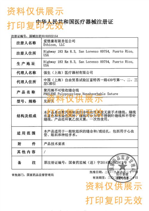 本產(chǎn)品是由聚丙烯制成的非吸收性單股無菌手術(shù)縫線??p線有藍色和未染色兩種??p線可分為帶不銹鋼針縫線和不帶針縫線。產(chǎn)品經(jīng)環(huán)氧乙烷滅菌,一次性使用