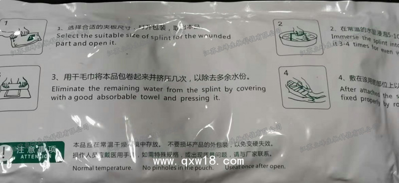 6、固定部位有皮外傷或需操作更長時間時,夾板可先不浸水,直接用紗布繃帶或彈性繃帶纏繞固定后在薄外層的無紡布上噴灑水來加速硬化;