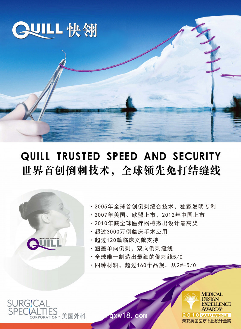 QUILL可吸收性外科縫線,又稱可吸收自封縫線,采用全球發(fā)明專利360度DNA螺旋式倒刺設(shè)計(jì),具有雙向倒刺縫合技術(shù)和單向倒刺縫合技術(shù),實(shí)現(xiàn)連續(xù)全層或多層縫合自動(dòng)關(guān)閉傷口,無(wú)需打結(jié)。徹底解決腔鏡下打結(jié)難的問(wèn)題;張力沿傷口緣均勻分布,減少傷口周圍組織損傷,連續(xù)全層縫合,產(chǎn)生更好的水密屏障,消滅手術(shù)部位死腔,連續(xù)錨定縫合,傷口密閉性好,減少傷口滲血,輔助止血,減輕血腫形成,有利于促進(jìn)傷口愈合,預(yù)防傷口感染;用線量少,異物刺激反應(yīng)小,可吸收材料組織相容性好,大大減少線結(jié)反應(yīng);尤其適合感染傷口的再次縫合;皮內(nèi)縫合,傷口美觀,無(wú)需拆線,患者易于接受;QUILL可吸收性外科縫線具有連續(xù)縫合的速度,間斷錨定的安全性,操作簡(jiǎn)單快速,縮短中青年醫(yī)生腔鏡手術(shù)學(xué)習(xí)曲線,節(jié)省手術(shù)縫合時(shí)間,有效提高手術(shù)縫合質(zhì)量和效率,降低術(shù)后并發(fā)癥。