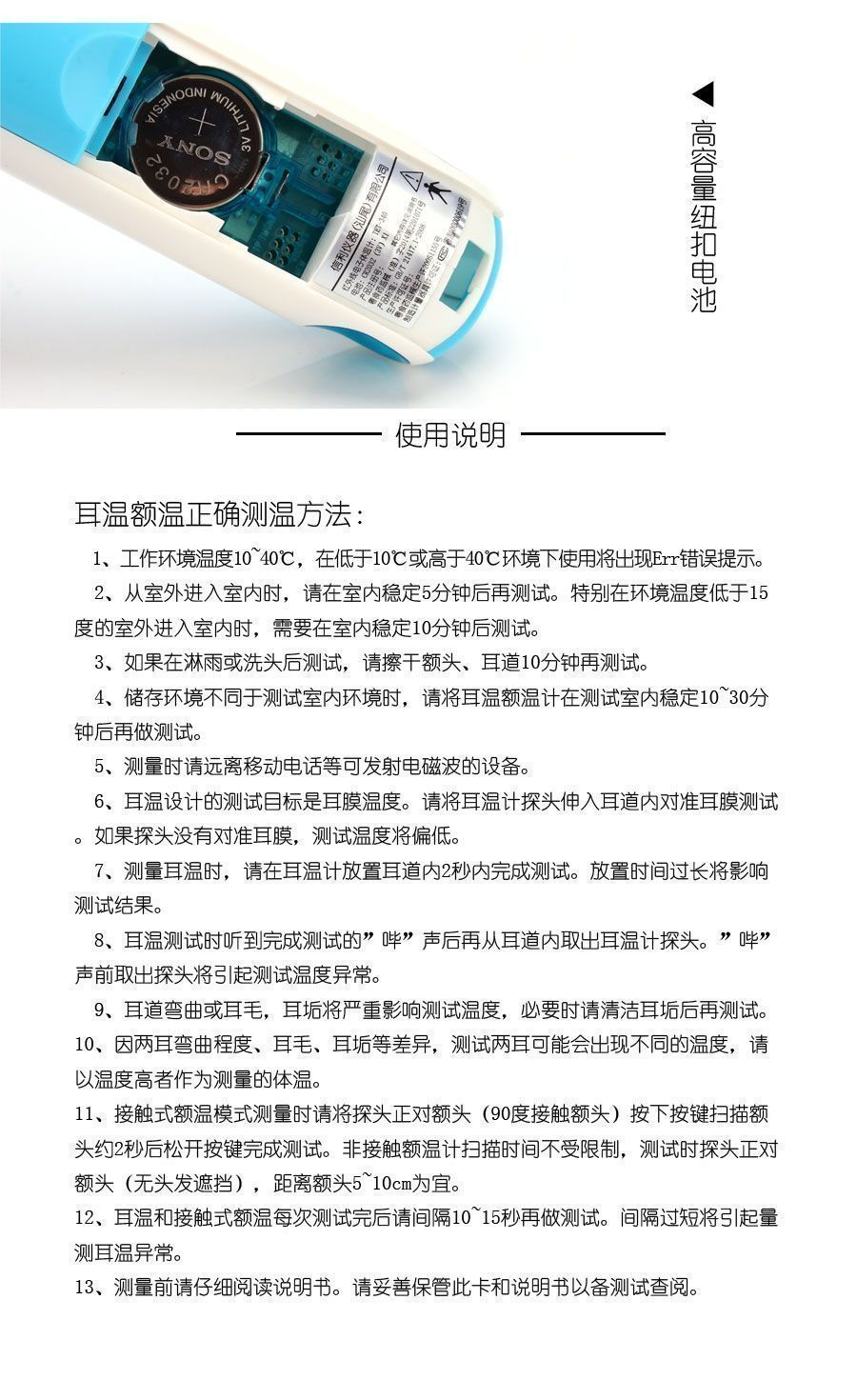 ??2、信利紅外線耳溫計(jì)是大屏幕背光清晰顯示,可調(diào)整設(shè)置參數(shù),存儲(chǔ)32個(gè)測量數(shù)據(jù),高溫報(bào)警方便安全。