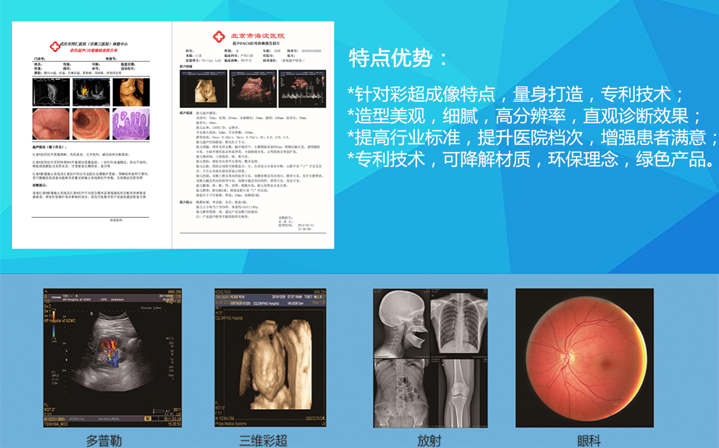 1.本產(chǎn)品主要應用于超聲科(B超、彩超、三維、四維)、眼科(AB超)、內(nèi)鏡室(胃鏡、腸鏡、腹腔鏡、支氣管鏡、宮腔鏡等)、五官科(耳鏡、鼻竇鏡、喉鏡等)、檢驗科(病理)等。