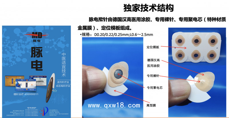 脈電撳針:一種含有特殊聚電裝置的可導(dǎo)電、可蓄電的無菌撳針;通過導(dǎo)入脈沖電流、存儲電子以增強穴位刺激,經(jīng)過長時間的穴位埋藏、24小時以上的持續(xù)刺激,從而達(dá)到治療各種疾病的目的。是將脈沖導(dǎo)入與撳針淺刺相結(jié)合,達(dá)到脈電撳針與留針治療效果的疊加作用,是在毫針電針治療的理論及應(yīng)用基礎(chǔ)上研發(fā)的新一代撳針產(chǎn)品。