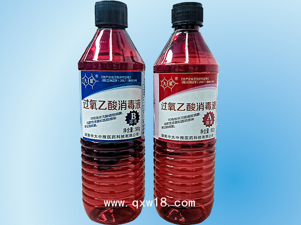 【產(chǎn)品主要成分及其含量】本品是以冰醋酸和硫酸組成的A溶液,及過氧化氫為主要成分的B溶液。A溶液中總酸量≥100%,B溶液中過氧化氫含量32%~33% 。合成后過氧乙酸含量為15%~18%。