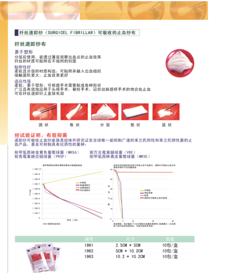 (3)使用方便:速即紗如織物,極易附著在不規(guī)則出血面,且在器械、手套等醫(yī)用器械表面無黏附。使用時可應(yīng)用縫、包、填、敷方法,幾乎所有外科手術(shù)方法均可廣泛應(yīng)用。故術(shù)中如出現(xiàn)結(jié)扎等止血方式無效時,可通過速即紗行小動脈、毛細血管、靜脈止血。&oq=可吸收止血紗布雜(速即紗)是由美國強生公司生產(chǎn),由再生氧化纖維素制成,性質(zhì)如織物,可以按出血部位修剪成任意形狀,具有一定的抗菌能力,且價格低廉。%E2%80%82作為纖維素衍生物的一種,其具有良好的生物相容性、生物可降解性和無毒等特點。再生氧化纖維素是纖維素經(jīng)氧化處理成為纖維素酸薄紗狀或棉布狀可吸收止血材料,具有棉紗的外觀質(zhì)地,柔軟而菲薄易于包裹、填塞等操作。其止血機制是將創(chuàng)面血液中的血小板聚集在網(wǎng)眼紗布上,迅速形成凝膠狀黑色物質(zhì),凝結(jié)血塊,從而達到止血的目的。其不依賴于人體內(nèi)正常的凝血機制,而是通過物理作用迅速促使血液凝固,有效控制小血管出血。質(zhì)軟的獨特特性和質(zhì)地使它可以修剪成符合出血部位的任何形狀,更易與出血部位充分接觸,提高止血效果可助形成血栓達到快速止血效果,其作用特點為: