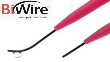 BiWire導(dǎo)絲可為建立輸尿管操作通道提供兩種選擇,其兩端均為軟頭(一端直頭、一端彎頭),任何一端均可作為導(dǎo)引端通過扭曲的輸尿管,BiWire這種二合一的特性可降低庫存需求。鎳鈦合金芯在極度彎曲時也不會發(fā)生扭折,1比1扭矩控制使導(dǎo)絲可通過挑戰(zhàn)性部位。AQ涂層為親水性聚合物超薄涂層,激活后能吸附并保存水分和其它液體,推進時表面摩擦阻力低,易于推進。