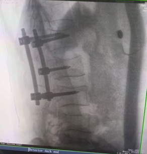 例如治療先天性脊柱側(cè)后凸畸形,由于脊柱自身復(fù)雜的解剖結(jié)構(gòu)限制,使得脊柱外科手術(shù)對(duì)于準(zhǔn)確度有著較高要求。以往我們只能采用傳統(tǒng)的正側(cè)位圖像來(lái)判斷螺釘置入的位置,現(xiàn)在三維C形臂特有的類CT斷層成像,使得治療過(guò)程可視化,立體化,在術(shù)中非常直觀地判斷螺釘植入的準(zhǔn)確度??捎行б龑?dǎo)術(shù)者植入后路螺釘并切除半錐體。同時(shí)可以在術(shù)中實(shí)時(shí)驗(yàn)證手術(shù)效果。有效地縮短了手術(shù)時(shí)間,降低手術(shù)風(fēng)險(xiǎn),避免了不必要的術(shù)后翻修手術(shù)。
