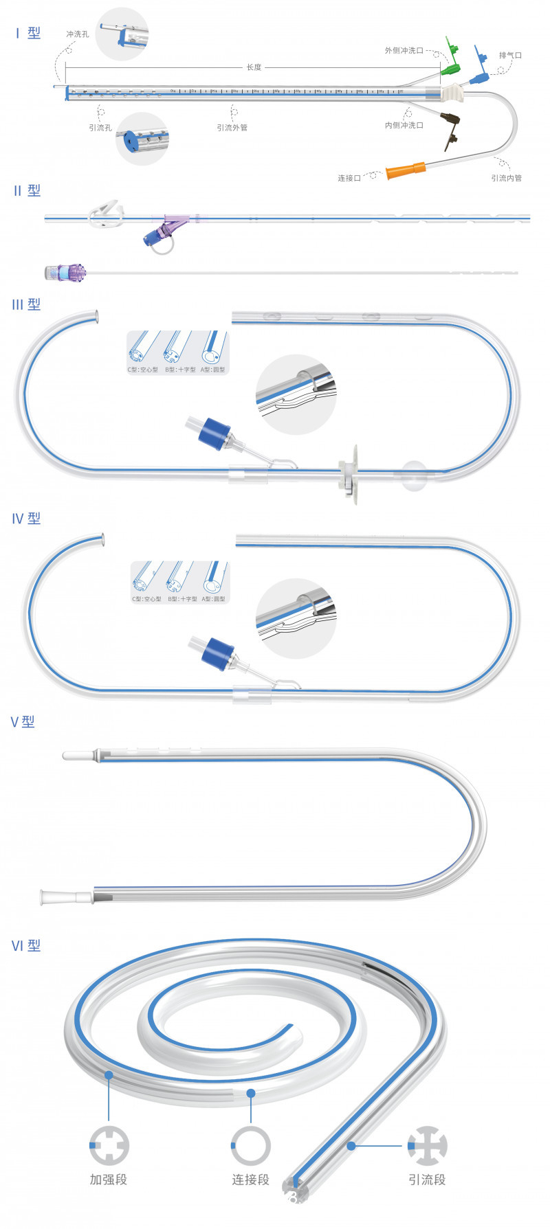 一次性使用多功能引流導管根據(jù)主要結(jié)構(gòu)不同可分為YN-F-Ⅰ、YN-F-Ⅱ、YN-F-Ⅲ、YN-F-Ⅳ、YN-F-Ⅴ、YN-X-Ⅵ六個型號。YN-F-Ⅰ型由引流管、套管、沖洗管、排氣管和接頭組成;YN-F-Ⅱ型由引流段、連接段、閥門、羅伯特夾、沖洗管組成;YN-Ⅲ型由引流段、連接段、球囊、固定夾、充起閥組成,YN-F-Ⅳ型由引流段、連接段、沖洗閥組成,YN-F-Ⅴ型由引流管和接頭組成,YN-X-Ⅵ型由引流管和引導針(選配)組成。本產(chǎn)品的引流管組件由硅橡膠制成,其他組件由PVC、ABS、PC、PE、POM、PP、304不銹鋼制成。