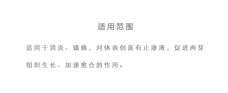 適用于消炎、鎮(zhèn)痛,對體表創(chuàng)面有止?jié)B液,促進肉芽組織生長、加速愈合的作用。