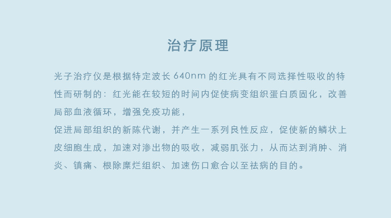 光子治療儀是根據(jù)特定波長640nm的紅光具有不同選擇性吸收的特性而研制的:紅光能在較短的時間內(nèi)促使病變組織蛋白質(zhì)固化,改善局部血液循環(huán),增強免疫功能,