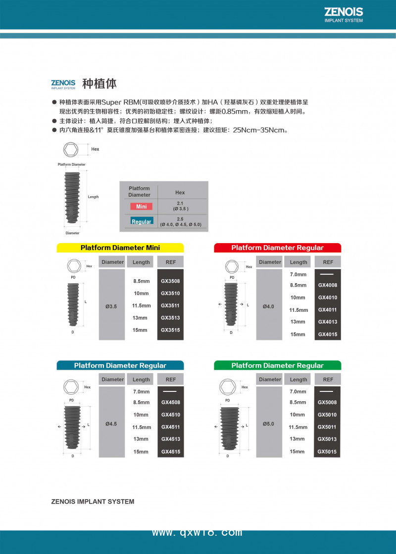 植體直徑有:3.5㎜、4.0㎜、4.5㎜、5.0㎜。