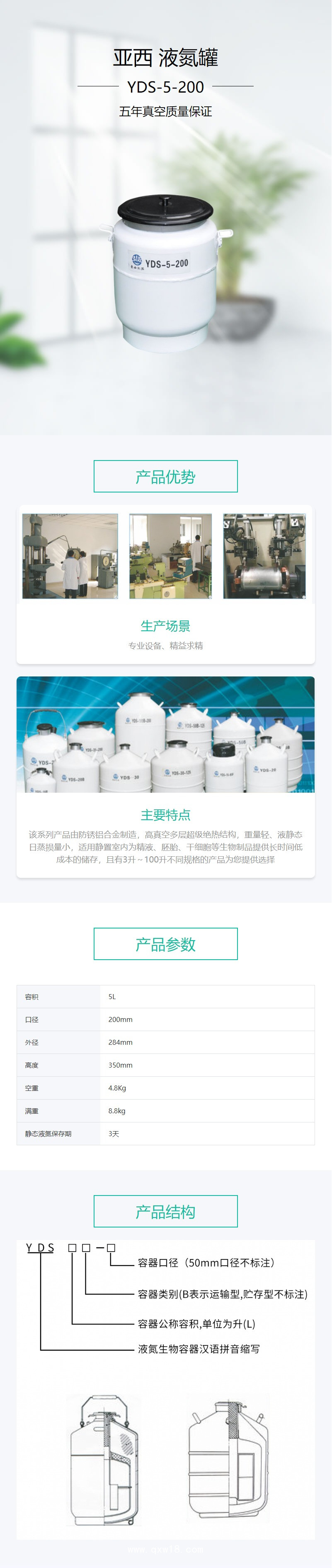品牌 亞西 ? 貨號(hào) V111425 ? 靜態(tài)保存天數(shù) 3天 ? 型號(hào) YDS-5-200 ? 容積 5L ? 空罐重量 4.8kg ? 滿罐重量 8.8kg ? 瓶口口徑 200mm ? 外徑 284mm ? 高度 350mm商品參數(shù)