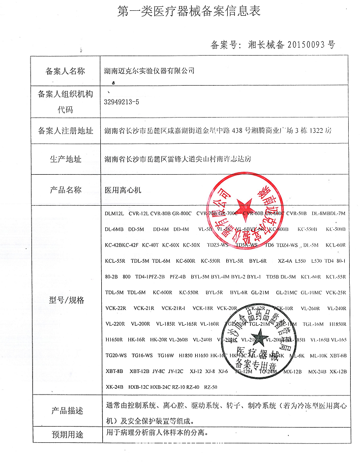 備案憑證號:湘長械備20150093號
