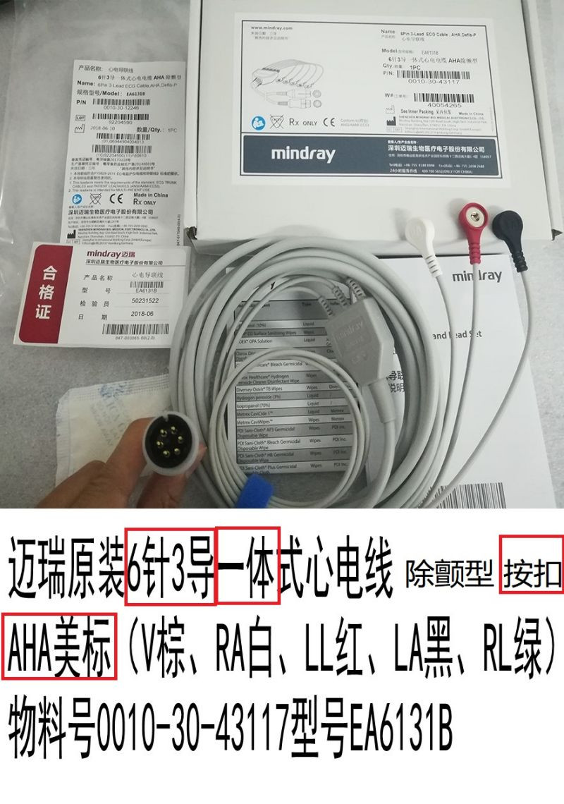 邁瑞原裝6針3導(dǎo)一體式心電導(dǎo)聯(lián)線 除顫型 按扣式 AHA美標(biāo)(V棕、RA白、LL紅、LA黑、RL綠)物料號(hào)0010-30-43117型號(hào)EA6131B