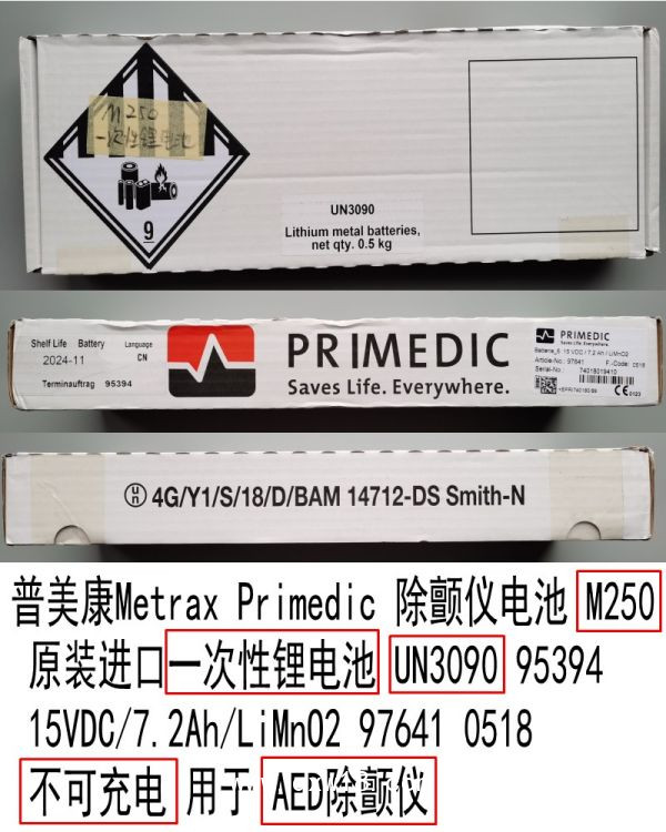 普美康Metrax Primedic 除顫儀電池 M250 原裝進口一次性 鋰電池 UN3090 95394 15VDC/7.2Ah/LiMnO2? 97641 0518 不可充電 用于AED除顫儀 PRIMEDIC HeartSave PAD