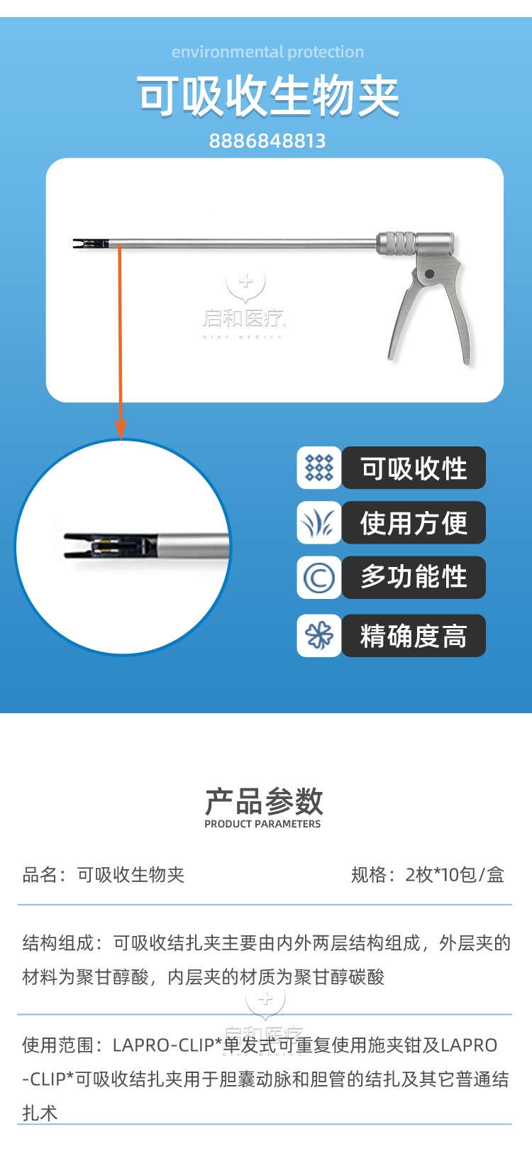 2、可吸收夾鉗口寬,可避免切割組織;施夾器360度旋轉,操作方便。