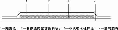 【結(jié)構(gòu)性能】?由隔離紙、非織造殼聚糖敷料塊,非織造吸水纖維布、透氣膠布組合而成。