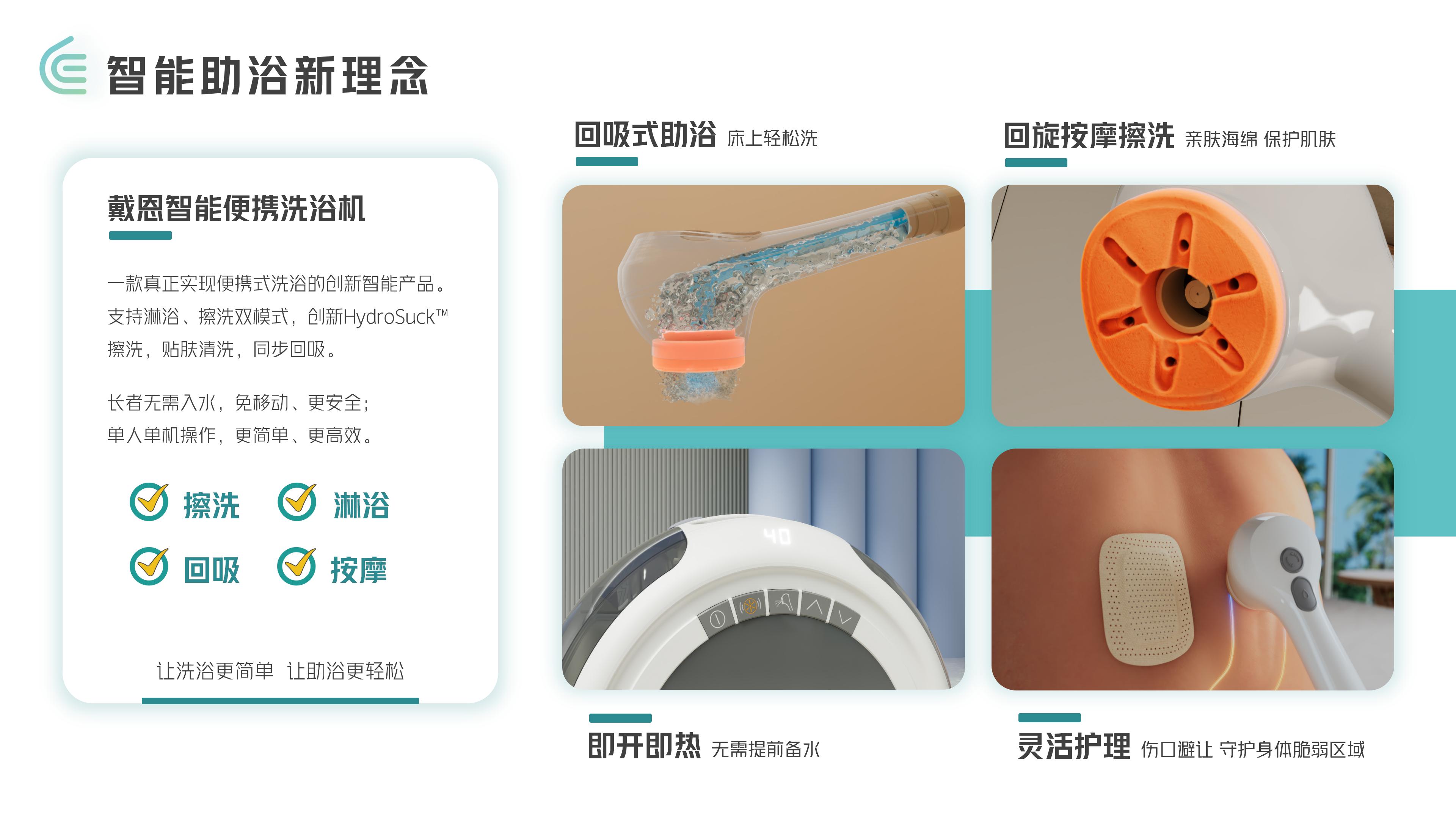 “智能便攜洗浴機”解決洗浴助浴難題,創(chuàng)新回吸式洗浴,免入水、免移動、床上擦洗更安心,即熱恒溫、便攜靈活,適用更多場景。智能助浴不僅幫助用戶便攜助浴,還推動護理行業(yè)增質(zhì)提效、革新護理模式,真正讓洗浴更簡單,讓助浴更輕松。