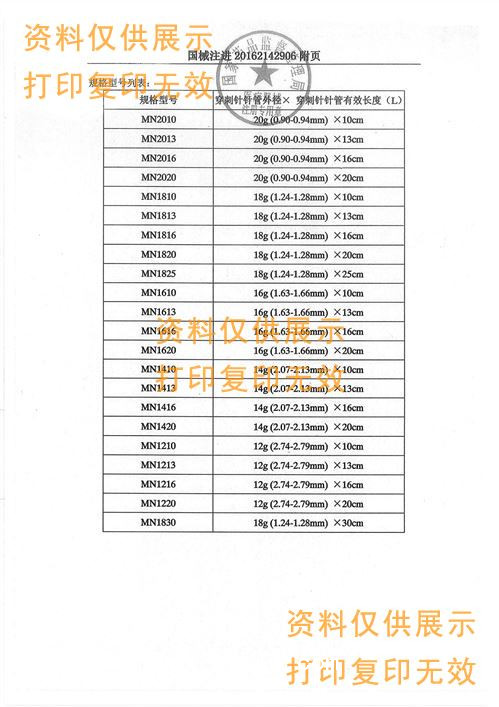 ? ? 一次性使用活檢針由不銹鋼穿刺針和針芯組成。穿刺針上刻有厘米刻度標(biāo)識(shí),不銹鋼材質(zhì)均為304不銹鋼(美國(guó)牌號(hào)為S30400,中國(guó)牌號(hào)為0Cr18Ni9)?;顧z針手柄的顏色代表不同直徑:黃色=20G、粉紅色=18G、紫色=16G、綠色=14G、淺藍(lán)色=12G